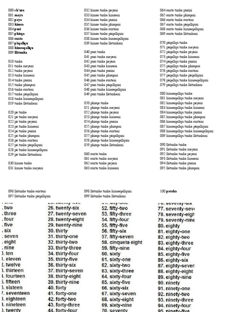 Numero S Del 1 100 En Ingles Y Aymara
